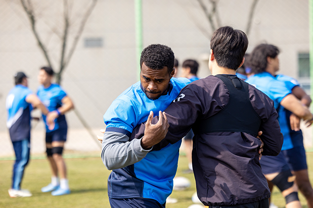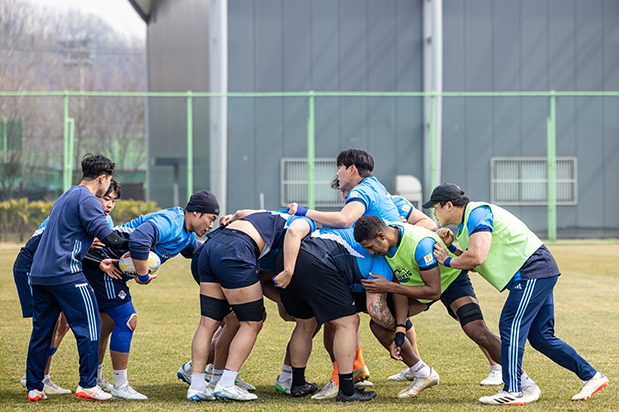 현대글로비스 럭비단은 겨울 내내 전지훈련을 이어왔다. 러닝과 웨이트 트레이닝으로 체력을 끌어올리고, 태클과 접촉 훈련으로 몸을 단련한다. 스크럼과 라인아웃, 실전을 가정한 반복 훈련까지. 선수들은 하루에도 몇 번씩 몸을 부딪치며 경기 감각을 끌어올렸다. 힘들지 않았냐는 질문에 장현구 선수는 담담하게 답한다.